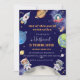 Design do espaço exterior admirável, com design de aquarela com foguetes, planetas, estrelas e animais da floresta de astronauta giros, um guaxinim e um urso com este design cósmico acrescenta um toque lúdico e imaginativo à sua celebração.