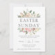 Um bonito buquê floral de peônias cor-de-água rosa e rosas de marfim enquadra este adorável convite para o almoço de domingo de Páscoa. As manchas de sábio saem decoradas em meio ao conjunto de flores de pêssego que cercam o belo convite. A pincelada de volta a esta carta adiciona um toque doce e elegante.