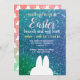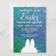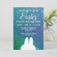 Silhueta de coelho branco, simples e bonito em combinação com tendências, brilho, fundo holográfico brilhante. Convites modernos, únicos e coloridos de Páscoa e caçada de ovos.