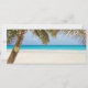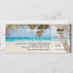 Convites de casamento de embarque com destino à praia com um cenário de praia tropical com palmeiras, luzes cintilantes, um coração esculpido com suas iniciais e um modelo de casamento moderno.