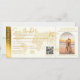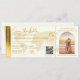 Convite de passagem de embarque de casamento com um mapa mundial de destino dourado elegante, bússola, avião, um modelo de convite de casamento personalizado e uma seção de rsvp.
