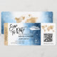 Destino Bilhete de Passagem de Avião Dourado Casamento na Praia Salve a Data com ícone de Navio de Cruzeiro com folhas tropicais. Adicione seu Código QR
