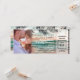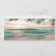 Convites de casamento com passagem de embarque para destino de praia, apresentando um cenário de praia tropical com palmeiras, uma foto do casal feliz, luzes cintilantes e um modelo de bilhete de casamento moderno.