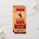 Olá! Celebre a sua Festa de aniversário com o nosso Convite de Passagem de Passagem de Passagem de Passagem do Partido Rodeio Cowboy. Design apresenta um vaqueiro na sua ilustração de cavalo rodeado sobre um fundo castanho vintage com um bilhete de entrada admite.