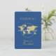 Convite para chá de bebê com tema de passaporte azul marinho e dourado em um cartão plano projetado para um chá de bebê com tema de viagem - uma maneira divertida de convidar convidados para um bebê com tema "a aventura começa". Use o editor avançado da Zazzle para alterar cores, fontes ou ajustar a disposição do texto de acordo com a quantidade de texto necessária na página de foto do passaporte e no carimbo falso de aprovação de visto.
