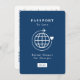 Passaporte para adorar com o contorno do globo e avião na frente; esquema do estilo passaporte no verso com sutil mapa mundial atrás; foto também