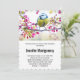 Chá de fraldas convite com uma fotografia incrível do pássaro mais bonito empoleirado num galho coberto de flores cor-de-rosa e folhas verdes. O pássaro tem uma cabeça azul e corpo amarelo com um rosto muito doce. Adorável.