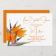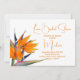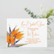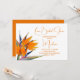Luau temático, modelo chá de panela com flores laranja-de-paraíso brilhante design. Papel horizontal com flores na borda esquerda. Texto é um roteiro moderno com grandes letras para o título e o nome da noiva. Texto laranja sobre papel branco, com muitas opções para atualizar o papel. Além disso, escolha a opção de download para compartilhar on-line ou impressão sua.