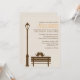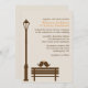 Convites de casamento quentes e bonitos apresentam uma ilustração romântica de dois pássaros amados tocados num banco de parque. Arte de Babystar Design.