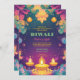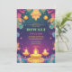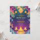 A frente do convite apresenta um fundo pastel macio com uma mistura harmoniosa de cores gentis, criando uma atmosfera serena e alegre. Na parte inferior, três delicadamente ilustradas lâmpadas Diya brilham com sotaques sutis e coloridos, acrescentando um toque de tradição. Os detalhes do evento são elegantemente escritos, complementando a paleta pastel. O verso do cartão continua o tema pastel, oferecendo espaço para textos personalizáveis e desejos de Diwali. O design geral é leve, vibrante e perfeito para uma celebração quente e convidativa de Diwali.