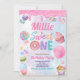 Bonito convite de aniversário em estilo. Tema: Doce Desserts Candy Land. Ocasião: Festa de aniversário. Estilo: Bonito, Cheio, Divertido, Elegante. Cores: Rosa, Roxo, Turquesa, Branco. Gráficos: Noz, rosquinha, pirulito, cupcake, macarrão, algodão doce, gelado, borrifadas, gotas de vidro.