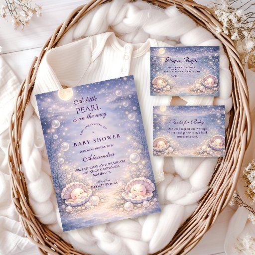 A dreamy coastal baby shower design inspired by soft pearls, seashells, and gentle ocean botanicals. Featuring a sweet smiling pearl in an oyster shell with airy pastel foliage and a warm vintage paper texture, this storybook-style artwork feels calm, elegant, and timeless—perfect for a serene seaside-inspired celebration.