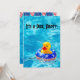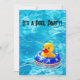 Pato amarelo flutuando com uma bóia salva-vidas de bandeira americana em uma piscina, usando um chapéu patriótico para um convite de festa na piscina.