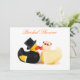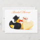 Noiva e patos de borracha de noivo se beijando. Chapéu superior e caudas com rosa vermelha. Convite de casamento ou cartão que pode ser personalizado com seu próprio texto, nomes, data e imagens.