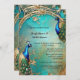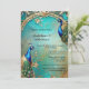 Um na moda e um design elegante sobre um fundo azul-claro malhado que tem flechas douradas e um quadro arquitetado no topo em que assenta um de dois pavões. O segundo está preso no canto inferior esquerdo e está olhando em direção a modelos pretas editáveis. Ambos os pássaros têm penas torácicas azuis vibrantes e radiantes e rosetas brilhantes nas caudas. Este design de inspiração de arte nouveau é ideal para um tema de "pavão" de casamento, chá de panela, noivado, aniversário ou chá de casais.