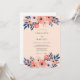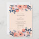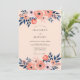 This design features a soft peach and navy blue color palette perfect for a romantic spring wedding. Delicate watercolor roses and ranunculus blooms create a lush border at the top and bottom. Deep indigo leaves provide a striking contrast against the pale cream backdrop, offering an elegant botanical aesthetic.