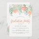 Este elegante design de convite à festa de formatura de aquarelas apresenta uma borda superior composta por pêssego mole e flores e folhas brancas, tudo sobre fundo branco.