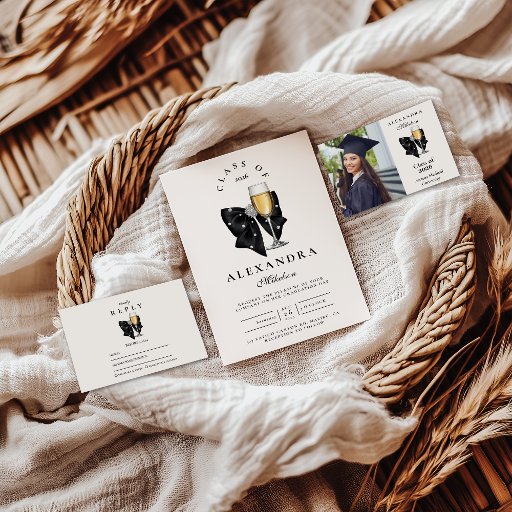 Celebrate her milestone in true coquette style with this elegant pearl-and-champagne graduation design. A soft blush backdrop, delicate bow details, and a shimmering coupe glass create a refined, feminine look that feels both celebratory and timeless. Personalize the text to feature your graduate’s name, event details, and reception information. A perfect choice for a sophisticated graduation gathering with a touch of vintage charm.