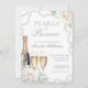 Delicate white pearl strands frame the invitation, adding a whimsical and luxurious touch. The design highlights watercolor elements, including a champagne bottle and glasses, subtle bubbles for a festive vibe, and soft white peonies with greenery for a fresh and classic feel.