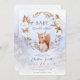 Este convite para chás de fraldas é doce e simples. Um pequeno esquilo come morango de galinha, que simboliza bebês felizes, e é cercado por flores de algodão. Neve e pinhal num fundo refletem a beleza da natureza. Solicitação de livro na parte traseira do cartão.