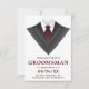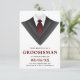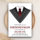 Convide seus padrinhos com este cartão de pedido moderno com um smoking clássico e gravata vermelha em um fundo branco. Basta adicionar os detalhes do seu evento neste modelo fácil de usar para torná-lo um convite único. Vire o cartão para revelar um padrão de listras pretas e brancas no verso do cartão.