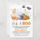 Este convite para chás de fraldas apresenta um tema brilhante do Dia das Bruxas. Um fantasma giro vestindo um chapéu laranja segura uma cesta em forma de abóbora. Ao redor dele está um caldeirão com névoa mágica, abóboras, folhas de outono e estrelas coloridas. Dois morcegos brincalhões sobrevoando, adicionando charme a este maravilhoso design sazonal.