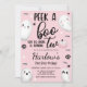 Uma festa de halloween não tão assustadora! Pastel cor-de-rosa Peek a Boo Ghost Halloween convite com fundo de faixa branca e preta.