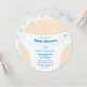 Um convite para o chá de fraldas com uma fralda de bebê num bebê com um tom de pele leve. O texto e o pino de segurança da fralda são azuis. Todas as palavras são personalizáveis. O tom de pele de fundo pode ser personalizado.