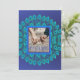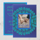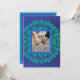 Modelo de convite de penas de pavão azul vibrante e verde-azulado. Este lindo design de pavão pode ser personalizado com a sua própria foto na frente e com os detalhes da celebração no verso.