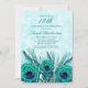 Convite de aniversário de 18 anos com penas de pavão azuis e turquesa glitter elegantes.