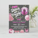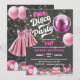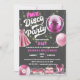 © Socialite Design Inc. & LICENSORS. Celebre uma festa de aniversário de discoteca convidando os convidados com este convite de aniversário de discoteca rosa e divertido. As cores são cor-de-rosa, branca e cinzas. O design incorpora uma bola de disco rosa fuchsia e luzes de cordas brancas / douradas como fundo. Os design incluem também um vestido cor-de-rosa, calçados rosas de pedra, uma bolsa rosa, um registro rosa e um balão cor-de-rosa. Personalize este convite divertido para a sua celebração especial.