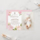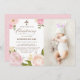 Convite de batismo floral, branco e elegante, com ilustrações de cor d'água desenhadas à mão de peões cor-de-rosa e rosas com padrão bolinhas atrás. Este convite de batismo fotográfico é perfeito para batizações de meninas. Este convite floral também será perfeito para batizações de primavera e jardim.