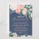 Este convite de bodas de ouro com peônias românticas azuis é perfeito para uma festa de aniversário de casamento elegante. O design floral apresenta flores em aquarela em tons de rosa claro, pêssego e branco em cascata sobre um fundo azul-marinho.