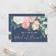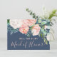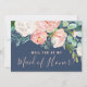 Este cartão de madrinha de casamento azul de peões românticos é perfeito para um casamento elegante. O design floral apresenta flores brancas, cor-de-rosa-claro, cor de pêssego e branco em cascata, em um fundo azul-marinho. Personalize a placa com o nome da noiva e da madrinha de casamento. Personalize a parte traseira do cartão com uma mensagem personalizada.