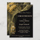 Textura rica e elegante de pepitas de ouro dispostas sobre um véu amarelo dourado. O design é preto e dourado com um texto claro dourado/marrom claro. Uma garrafa de Champanhe em um balde de gelo adiciona uma nota festiva encantadora ao seu evento.