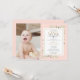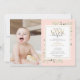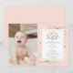 Convite de aniversário de primeiro ano da Little Miss ONEderful com elegantes folhagens em um fundo rosa, tipografia elegante e uma foto especial da aniversariante. Criado por Thisisnotme©