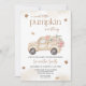 Convite de chá de fraldas de outono com design rústico, incluindo um caminhão de coleta, abóboras e folhas de outono.