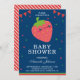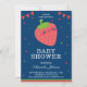 Surpreenda seus convidados com este chá de fraldas bonito convidam a caracterização de uma morango adorável com elementos vibrantes contra um fundo azul. Adicione simplesmente seus detalhes do evento neste modelo fácil de usar para fazer-lhe um convite um--um-amável. Lance o cartão sobre para revelar um teste padrão vermelho e branco elegante das listras na parte de trás do cartão.
