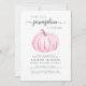 Um convite de chá para uma menina de outono fofo que apresenta "A Sweet Little Pumpkin Is On Her Way" na tipografia de cinzas e um roteiro de na moda, e uma aquarela rosa de uma abóbora. Personalize o nome da mãe e os detalhes do chá em simples tipografia.