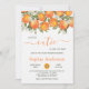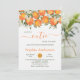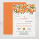 Um Pequeno Convite De Chá de fraldas Laranja. Citrinos botânicos, laranjeiras, pequenos chás de fraldas, com laranjas bonito, clementinas, ilustração de frutas de citrinos, ramos verdes e folhas com flores brancas e uma moderna letra de pincel de rocha ... perfeito chá de fraldas neutro em termos de gênero para a estação dos citrinos de inverno, primavera e verão!