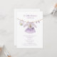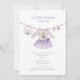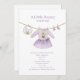 Tema do chá de fraldas de páscoa com ilustração inspirada em vintage de um vestido de Páscoa com coelhinho e arco de Páscoa, bib de ovo de Páscoa e botas de bebê penduradas na linha de vestidos. O convite tem um esquema de cor roxa lavanda.