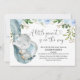O convite de chá de fraldas do Sweet boy com um tronco de elefante, elefante de bebê e texto com forma de coração. O design também apresenta algumas folhagens e rosas azuis.