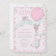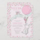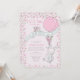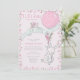 Um coelhinho está a caminho... um convite de chá de fraldas de menina bonitinho, com cor rosa gentil e cor verde de menta. O design é emoldurado por flores rosadas e distantes e apresenta um belo coelhinho com um pequeno buquê e um balão cor-de-rosa voando uma faixa verde-menta, amarrada com chá de fraldas, e decorada com um passarinho. O verso do convite tem o mesmo padrão floral caprichoso. Perfeito para um chá de fraldas, verão, giro, páscoa ou tema de coelho.