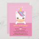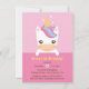 Um belo convite para o primeiro aniversário da menina! O convite apresenta um pequeno e bonito unicórnio bebê com um homem rosa e azul brilhante. Um padrão cor-de-rosa e estrelas para o fundo. Personalize facilmente com os detalhes do seu partido.