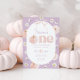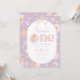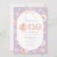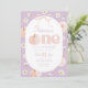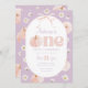 Uma abóbora fofa! Abóbora Floral e arco Convite para primeiro aniversario Previsto com fundo roxo com margaridas, abóbora e arco rosa fofo.