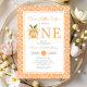 Um Pequeno E Bonito Convite De primeiro aniversario De Citros Laranja. Celebre o primeiro marco do seu filho com o nosso pequeno Convite para primeiros aniversarios de citrinos de laranja! Este doce design com uma fruta laranja encantadora com um arco é perfeito para a sua celebração de primeiro aniversário de verão. Peça agora! Acessórios correspondentes disponíveis.