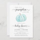 Um convite para o chá de um bebê casal giro, alegre e brilhante com "A Sweet Little Pumpkin Is On Your Way" na tipografia da cinza e no roteiro de na moda, e uma aquarela azul pastel de uma abóbora. Personalize os nomes dos pais e os detalhes do chá em uma simples tipografia de cinzas moderna.