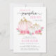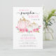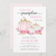Um convite de chá para uma menina fofinha com "Our Sweet Little Pumpkin Is On Her Way" escrito em uma mistura de tipografia moderna de rosa e cinza e um roteiro de na moda, e abóboras e florais de aquarela rosa e branca com acentos de ouro. Personalize facilmente os nomes do bebê e da mãe na tipografia rosa e os detalhes do chá na simples tipografia moderna.
