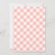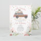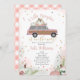 Convite para chá de fraldas de menina no outono, com ilustração de um SUV cor-de-rosa e madeira tocado com abóboras e cercado por confetti. O lado oposto é gingham rosa.