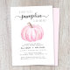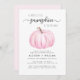 Um convite para chá de uma menina de outono fofo com "A Sweet Little Pumpkin Is On Her Way" escrito em tipografia de cinza e um roteiro de na moda, e uma aquarela rosa pastel de uma abóbora. Personalize o nome da mãe e os detalhes do chá em simples tipografia.